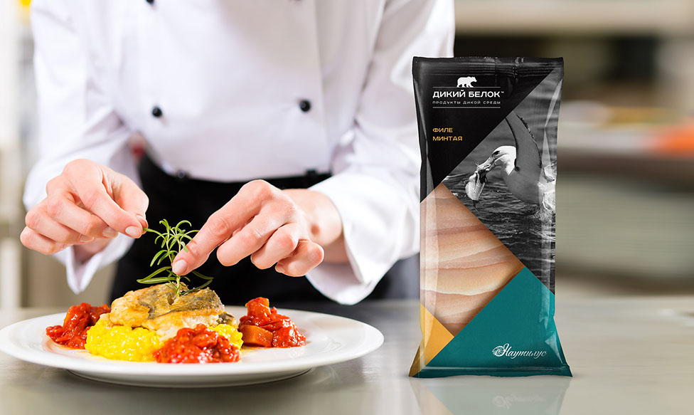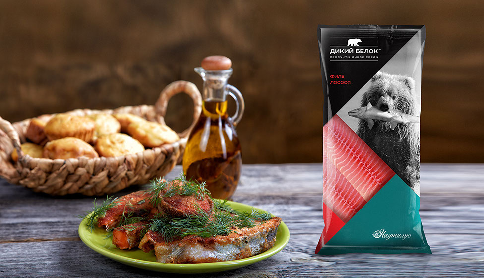 «Дикий белок» — это новая серия замороженной продукции от компании «Наутилус», в производстве которой используется исключительно рыба, выловленная в дикой среде. Бренд позиционируется в премиум-сегменте. В качестве центрального элемента упаковки использованы фотографии, показывающие процесс «дикого улова» — люди и звери, добывающие рыбу. Черно-белый стиль фотографий добавляет драматизма и выделяет продукт на полке.